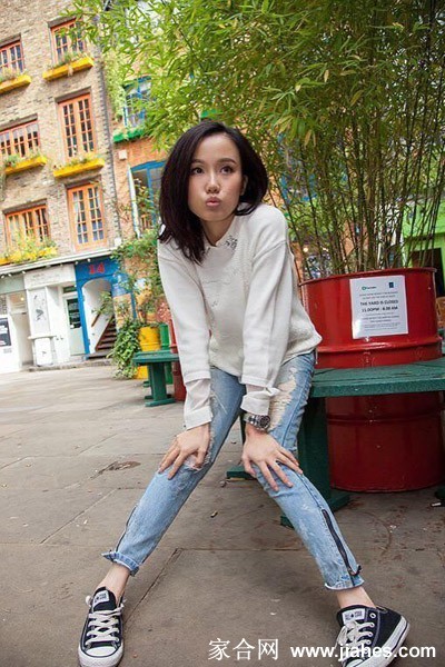 黄龄坐在台阶上托腮微笑,眼神灵动充满故事,周围是充满生活气息的街景