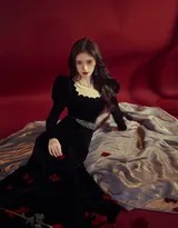 服装在这组作品中扮演了至关重要的角色。丝绒、缎面、蕾丝等充满质感的面料,以墨绿、酒红、暖橙等浓郁却不失沉静的色调呈现,完美衬托出她白皙的肤色与纤细的身形。这些服装的剪裁往往强调腰线,或通过露肩、开衩等细节设计,恰到好处地展现女性柔美的曲线,而非直白的裸露,这正是复古性感的高级之处——于含蓄中流淌风情。